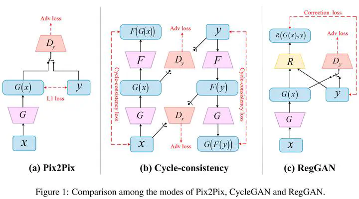 Supervised Pix2Pix and unsupervised Cycle-consistency are two modes that dominate the field of medical image-to-image translation. However, neither modes are ideal. The Pix2Pix mode has excellent performance. But it requires paired and well pixel-wise aligned images, which may not always be achievable due to respiratory motion or anatomy change between times that paired images are acquired. The Cycle-consistency mode is less stringent with training data and works well on unpaired or misaligned images. But its performance may not be optimal. In order to break the dilemma of the existing modes, we propose a new unsupervised mode called RegGAN for medical image-to-image translation. It is based on the theory of “loss-correction”. In RegGAN, the misaligned target images are considered as noisy labelsaand the generator is trained with an additional registration network to fit the misaligned noise distribution adaptively.The goal is to search for the common optimal solution to both image-to-image translation and registration tasks. We incorporated RegGAN into a few state-of-the-art image-to-image translation methods and demonstrated that RegGAN could be easily combined with these methods to improve their performances. Such as a simple CycleGAN in our mode surpasses latest NICEGAN even though using less network parameters. Based on our results, RegGAN outperformed both Pix2Pix on aligned data and Cycle-consistency on misaligned or unpaired data. RegGAN is insensitive to noises which makes it a better choice for a wide range of scenarios, especially for medical image-to-image translation tasks in which well pixel-wise aligned data are not available. Code and data used in this study can be found at https://github.com/Kid-Liet/Reg-GAN.